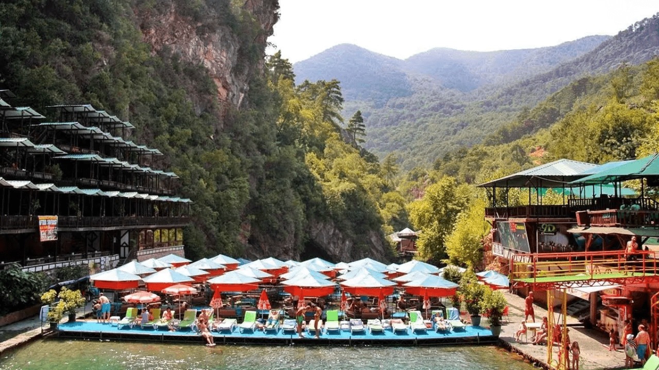 После прогулки туристы отправляются к реке Димчай, где расположен необычный ресторан прямо на воде. Террасы на деревянных помостах позволяют отдыхать почти над самой рекой. В меню – свежая рыба на гриле, курица, гарниры, салаты и традиционные турецкие закуски.