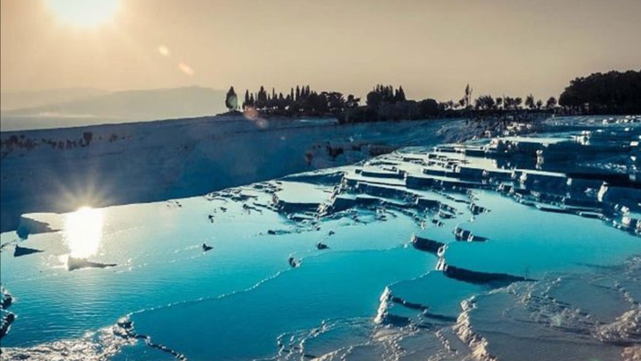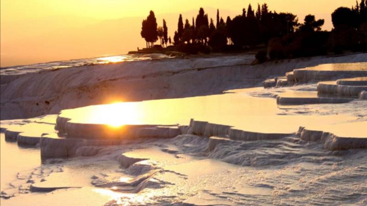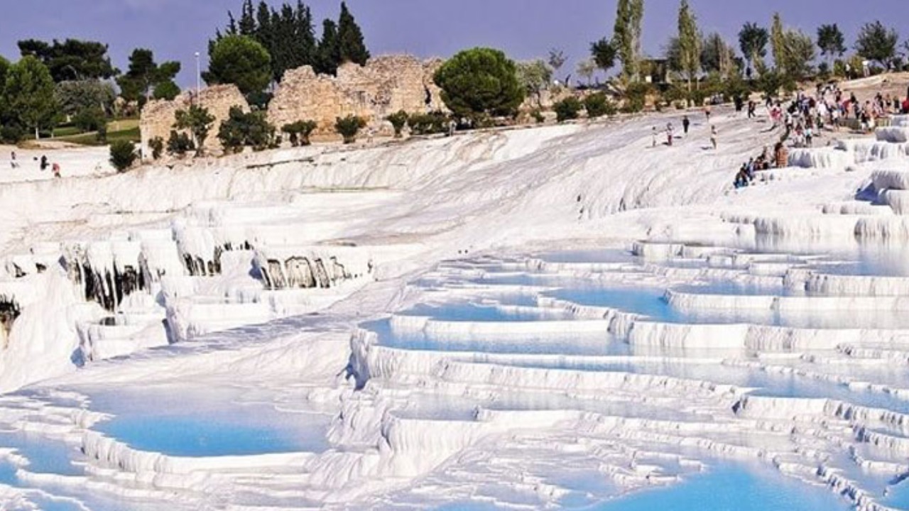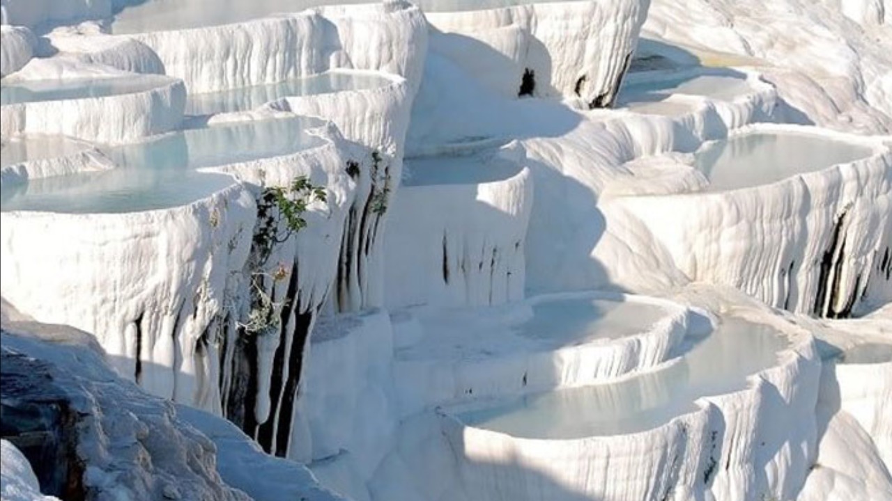 Многочисленные травертиновые бассейны образовались в результате длительного процесса отложения минеральных солей. Вода в травертинах имеет температуру 35 градусов, а из-за большого содержания солей и кальция она практически белого цвета.