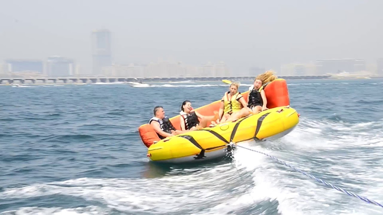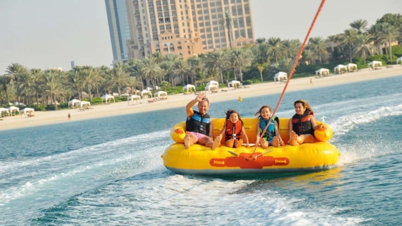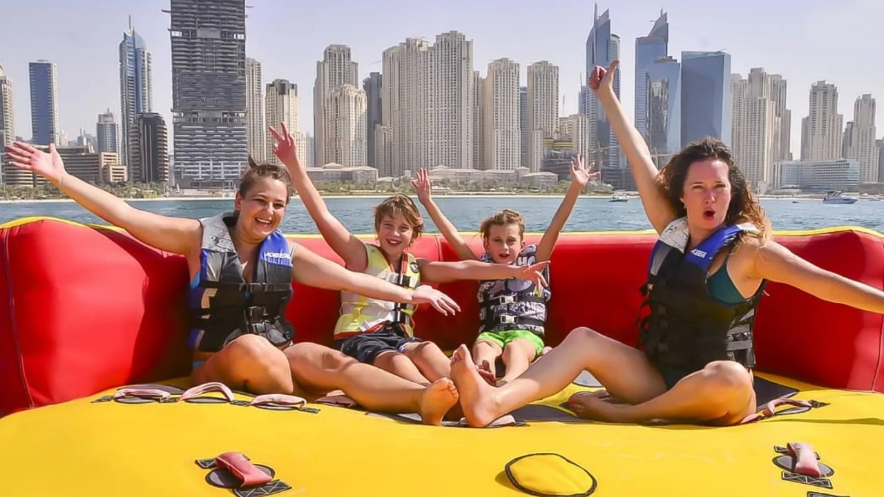 Вы начинаете приключение в районе рядом с легендарным отелем Бурдж Аль Араб — одной из самых узнаваемых достопримечательностей Дубая. К вам подходит скоростная лодка с буксируемым надувным пончиком — большим круглым надувным кругом, который за счет скорости лодки подпрыгивает на волнах, создавая массу драйва и эмоций.