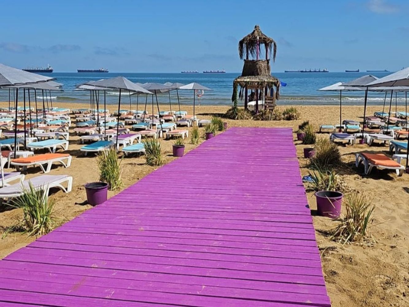 Песчаный пляж, удобные кабинки для переодевания, душевые, шезлонги и зонтики — всё необходимое для вашего удовольствия и релаксации. Отличное место для отдыха с детьми или в компании друзей.
