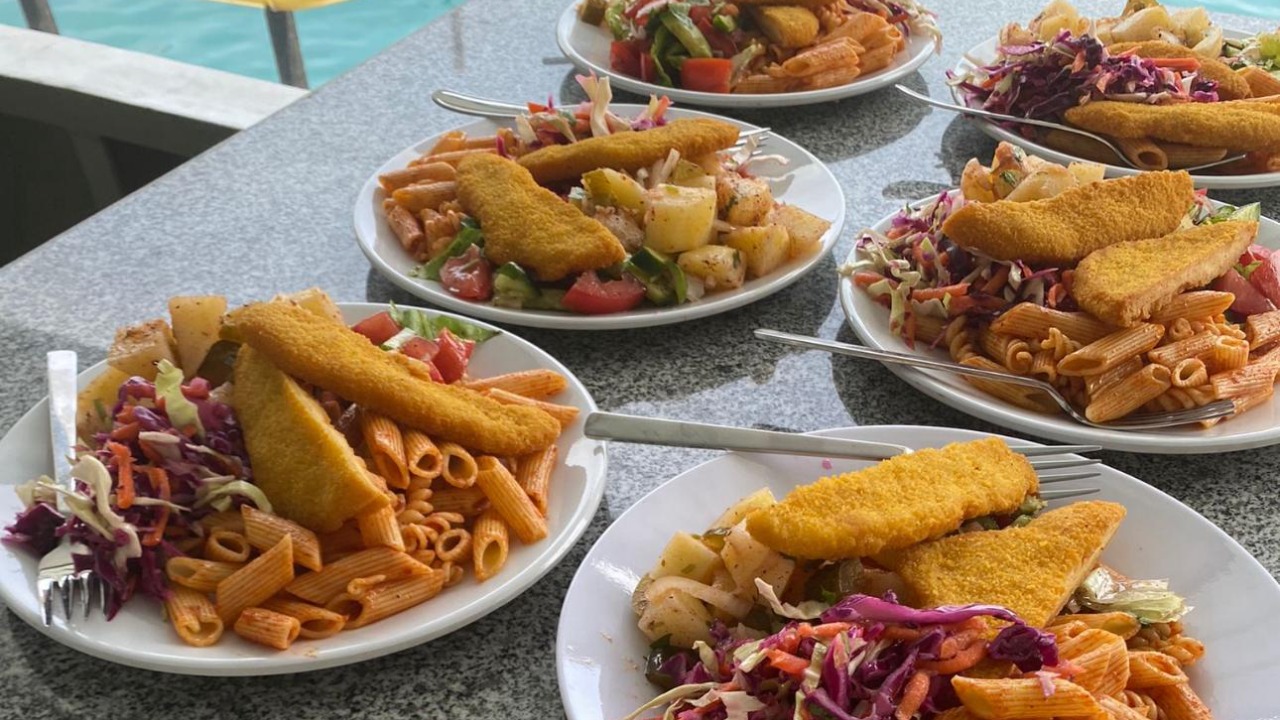 Во время этой остановки сервируется обед: вкусные макароны, свежий салат и аппетитный куриный шницель.