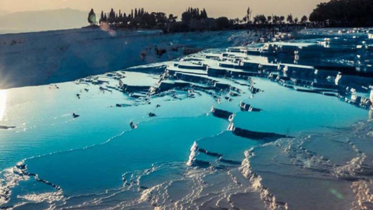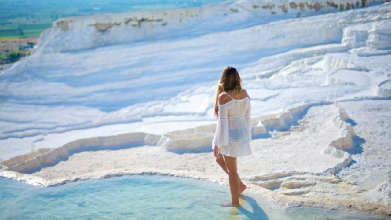 Самым излюбленным местом гостей Турции, да и местных жителей, являются травертины. Гора, покрытая хрупкими горными породами, создаёт ощущение, будто вы находитесь в холодном месте, однако температура воздуха составляет +35°С. Уникальное природное явление образовалось за счет выброса и на роста осадков соли кальция из горных источников. Также на горе есть небольшие бассейны с термальной водой, температура которой варьируется от 35 до 100 градусов. Впечатления от этого места невероятные! Если вы планируете поездку в Памуккале, то “Хлопковый замок” стоит обязательно включить в список посещения.